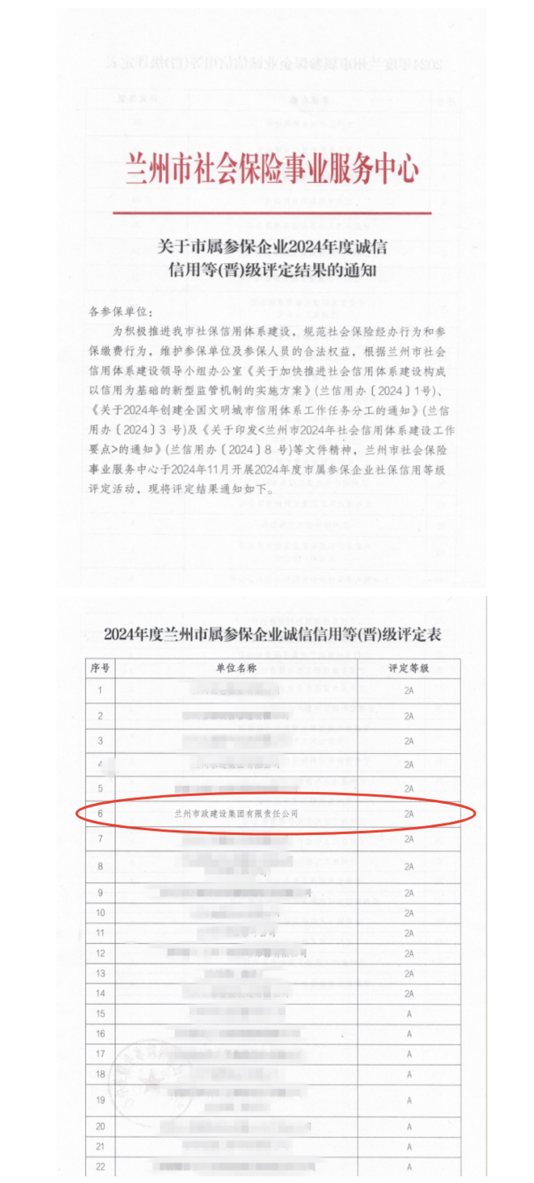 近日,蘭州市社保中心公布了市屬參保企業(yè)2024年度誠信信用等級評定結(jié)果,蘭州市政建設(shè)集團(tuán)成功獲評2A等級,為市級社保信用評定的最高等級。